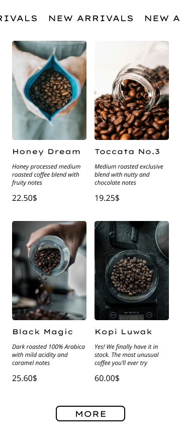 To enhance user engagement with new product releases, I designed the Freshly Roasted Co. homepage with a ‘New Arrivals’ section positioned below the main banner and CTA button. This section uses a clean background and minimalist typography to guide user focus directly to the showcased products. High-quality product images play a crucial role in this design.